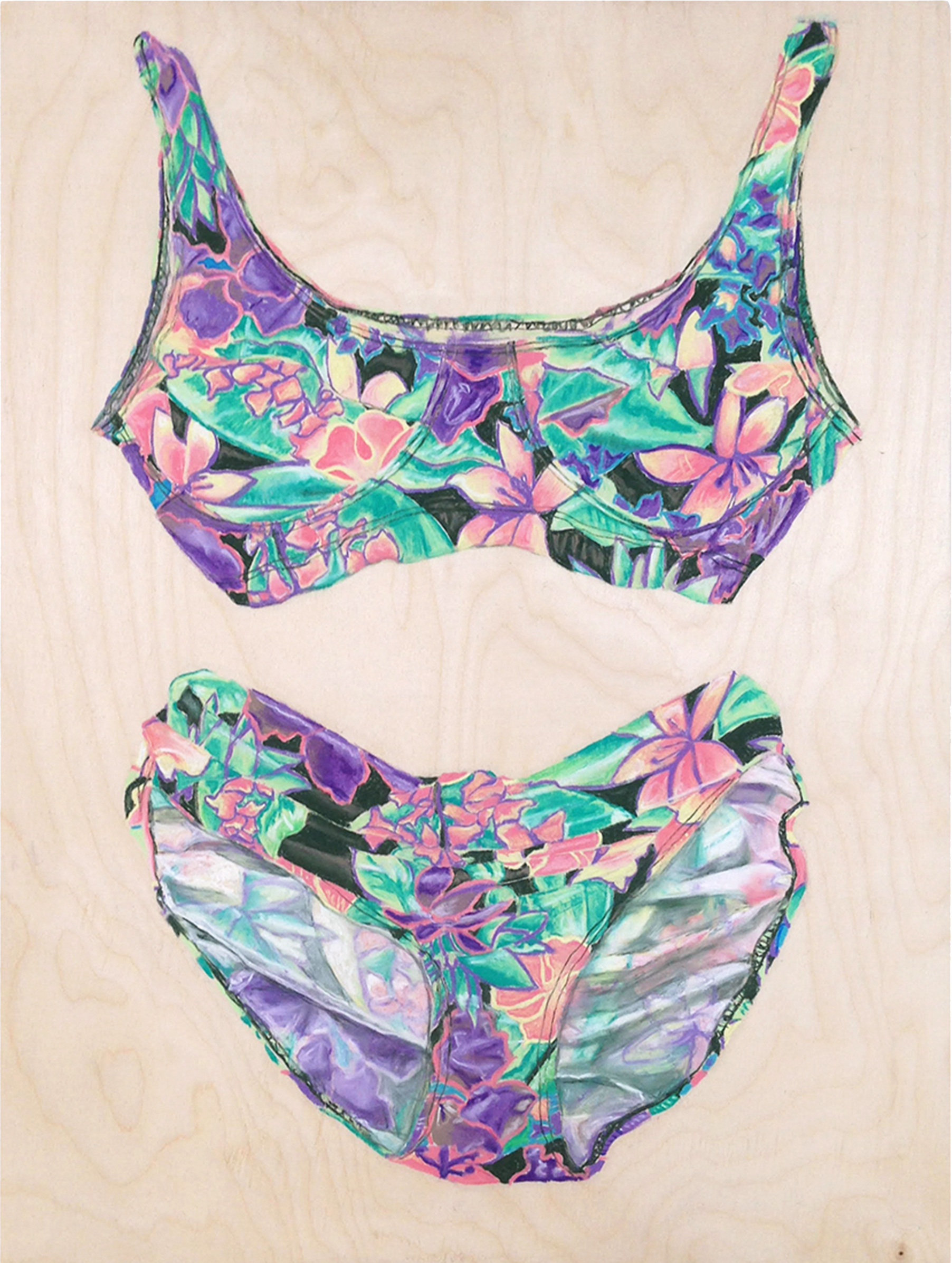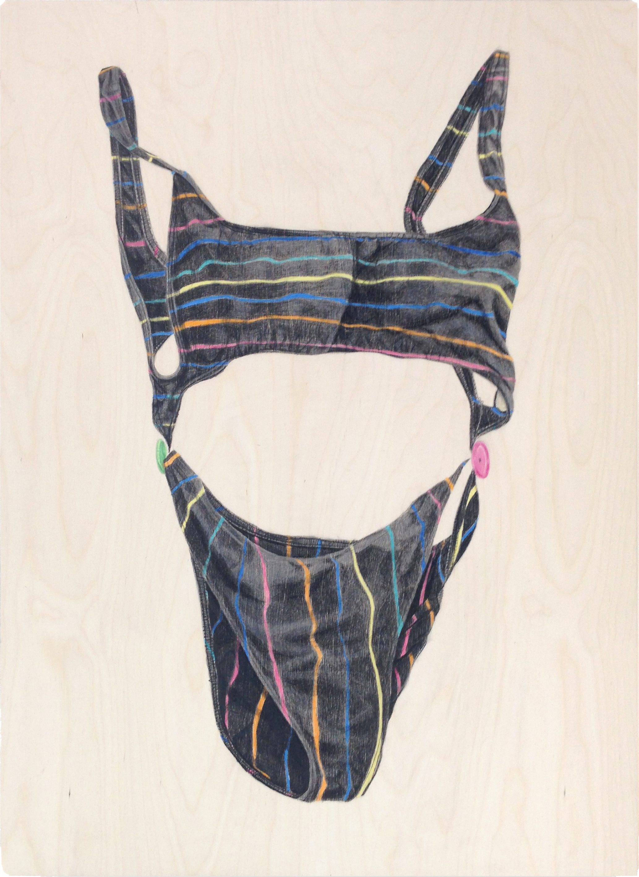 Intimate and surreal, her recent series of bathing suits is a celebration of pleasure, leisure, and the feminine form. The drawings, revealing and bold, strike an unashamed tone and exhibit a subtle sexuality. Void of a wearer, the clothing becomes animate, declaring itself a subject free for interpretation.